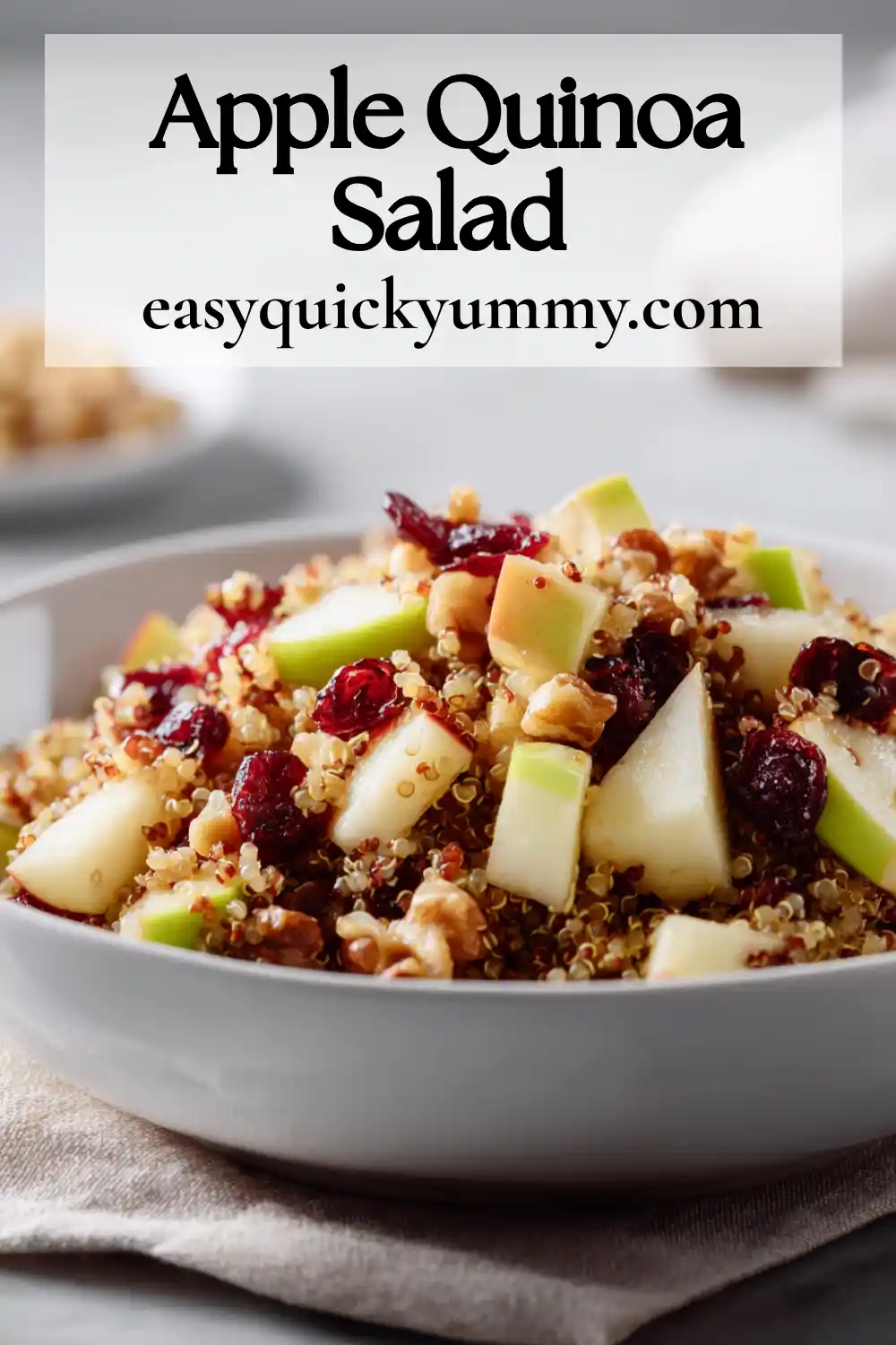 For busy days, treat this like a meal-prep hero: cook quinoa ahead, store it chilled, and dice apples right before serving (or toss apples with a tiny bit of lemon to slow browning). Pack walnuts separately to keep them crunchy. Whether you serve it at a picnic, bring it to a potluck, or make it for a quick weekday lunch, this salad stays bright, colorful, and satisfying.