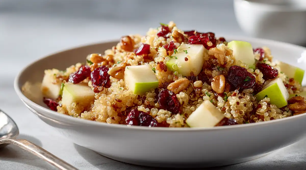 Ingredient spotlight: apples. Honeycrisp gives a sweet, clean bite; Granny Smith adds bright tartness. Either way, dice them evenly so the salad feels balanced and easy to eat. Quinoa is a complete protein and adds a mild, nutty taste that plays well with fruit. The cranberries add contrast, while walnuts provide crunch and richness. Together, you get a “texture explosion” that keeps the salad exciting instead of one-note.