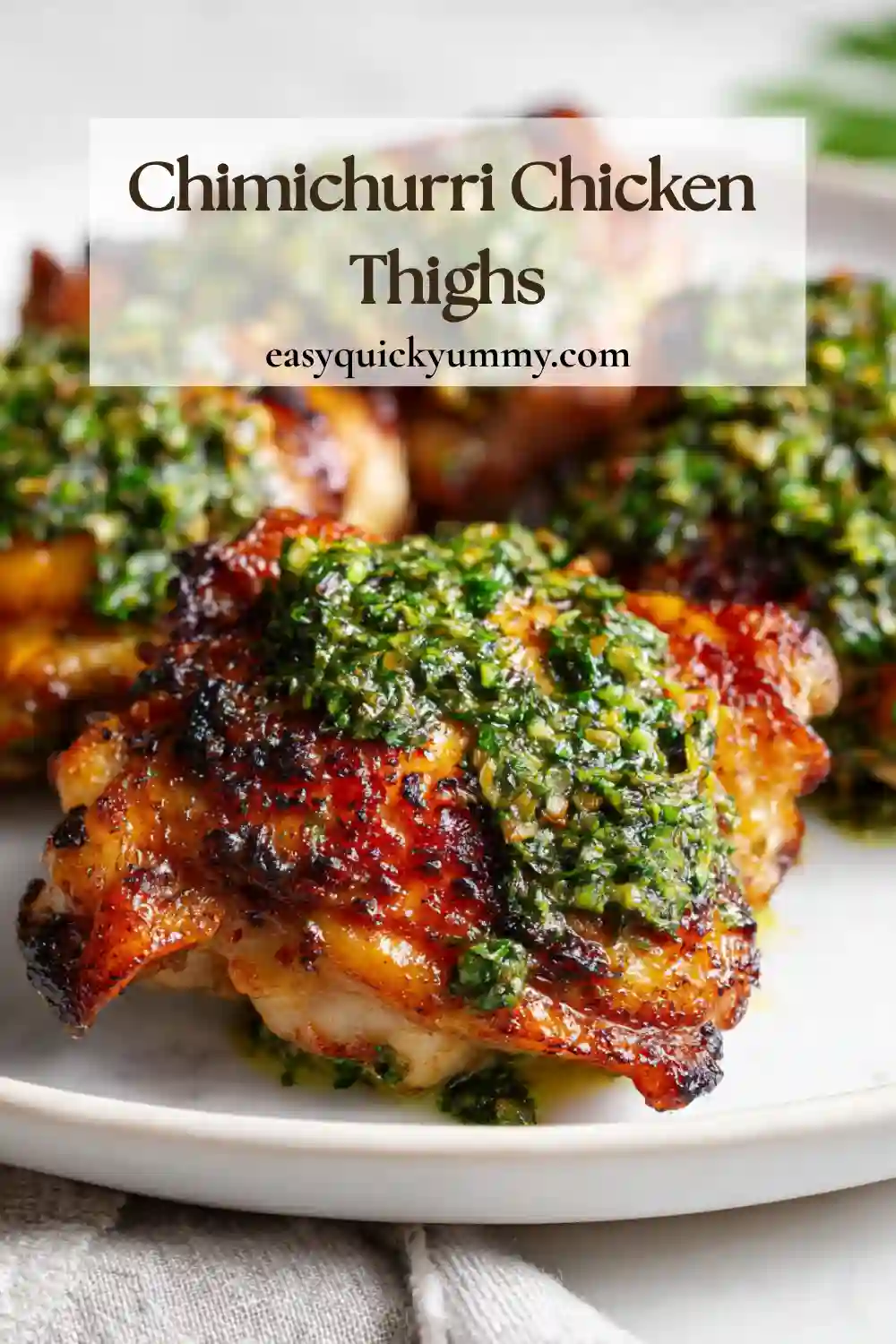 - Serve: Drizzle chimichurri over the hot chicken thighs and enjoy immediately.
