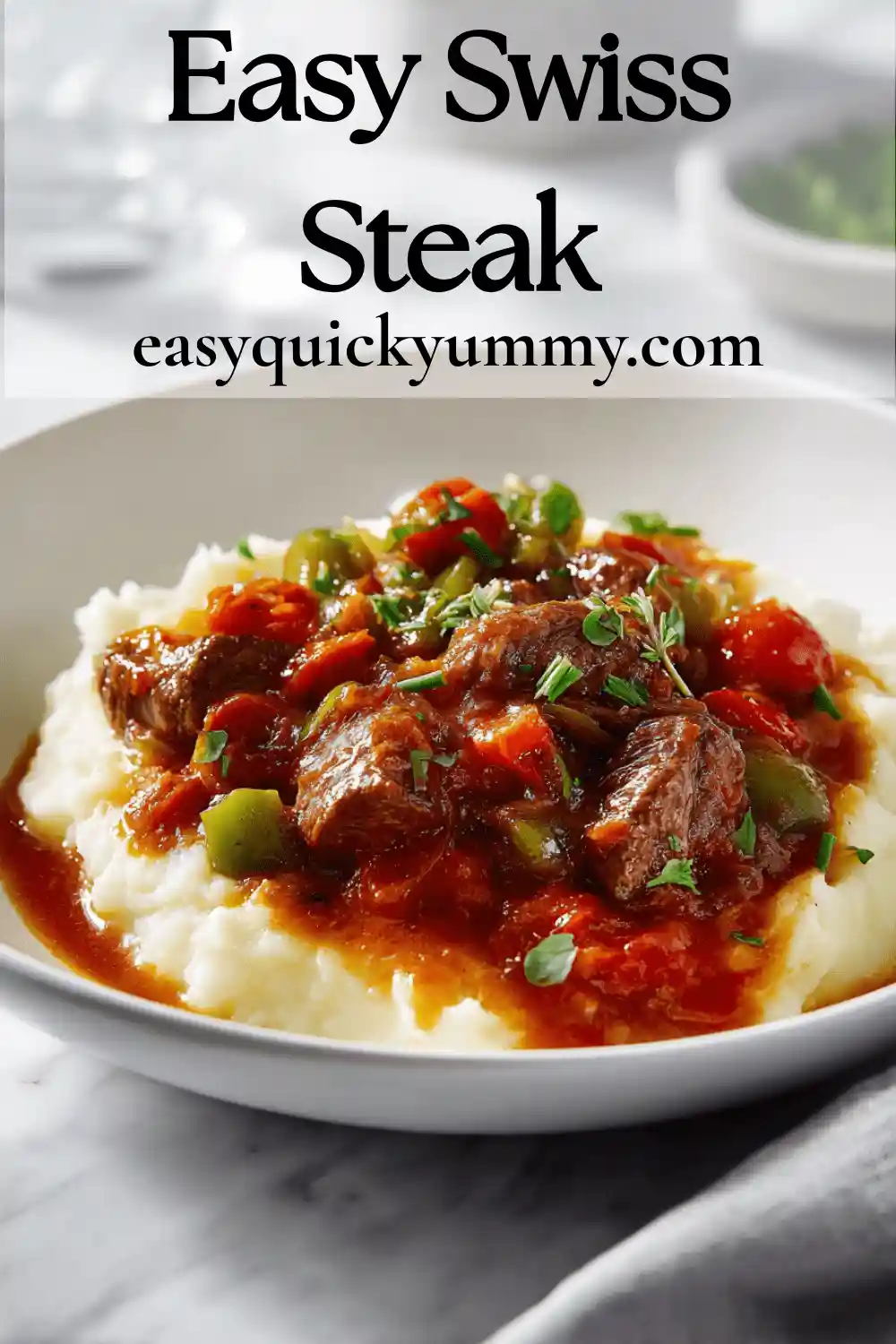 This easy Swiss steak is pure old-fashioned comfort food, just like mom used to make. Tenderized beef round steak slowly simmers in a cozy tomato and bell pepper sauce until it’s fork-soft and full of flavor. It’s the kind of meal that fills your kitchen with the most amazing smell and makes everyone wander in asking, “When’s dinner?” Serve this easy Swiss steak over fluffy mashed potatoes, rice, or buttered noodles for a hearty, family-friendly dinner that feels special but is simple enough for busy weeknights. It’s a classic, no-fuss recipe you’ll want to save to your favorite comfort food Pinterest board.