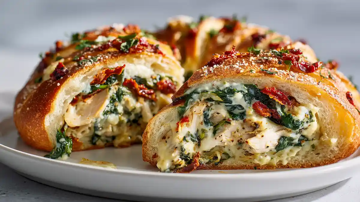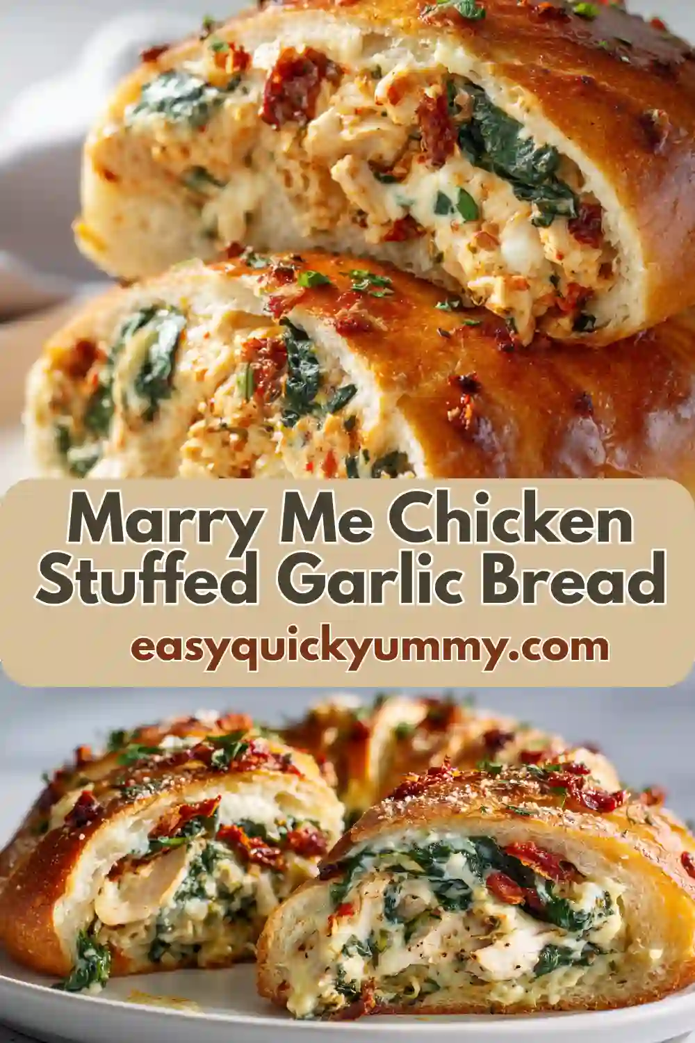 If you love the cozy “marry me” flavor trend but want it in a shareable, dunkable bread moment, this is for you. This Marry Me Chicken Stuffed Garlic Bread packs juicy chicken, punchy sun-dried tomatoes, a little tomato paste, parmesan, and just a touch of cream into one weeknight-friendly bake. It’s creamy without feeling too heavy, and the spinach melts right into the filling for a fresh pop of green. Perfect for a busy family dinner, game night, or an easy party appetizer that looks fancy with almost no effort. Save this one for when you want big flavor fast Pinterest-worthy and truly delicious.