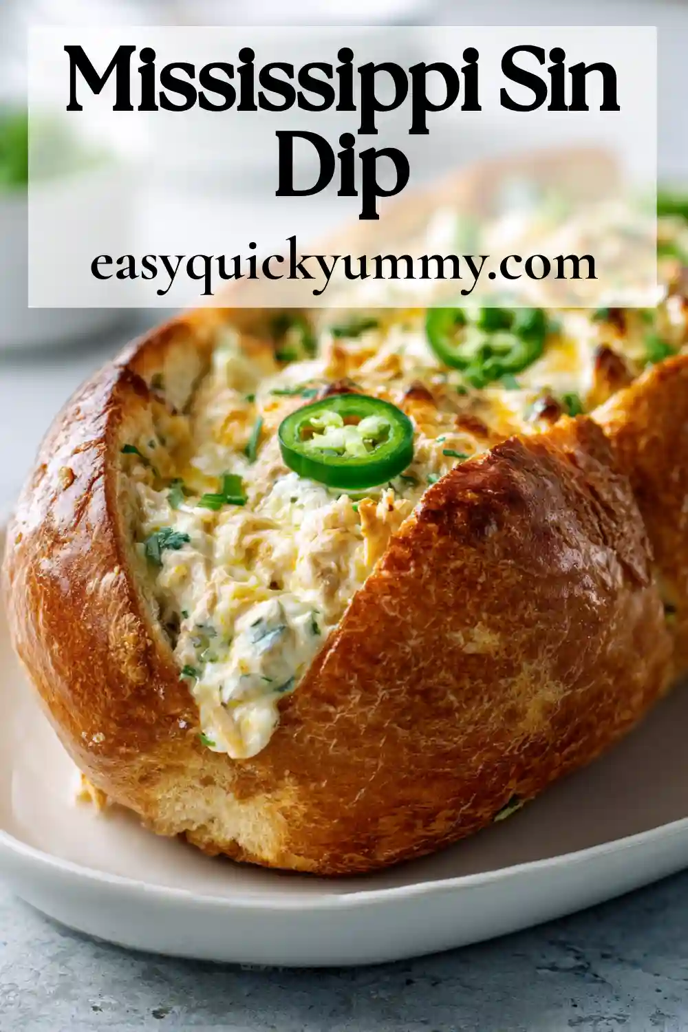 This easy Mississippi Sin bread dip is everything you want in a party appetizer: warm, cheesy, a little spicy, and totally scoopable. A crusty French loaf is hollowed out and stuffed with a creamy blend of Cheddar, sour cream, softened cream cheese, smoked turkey, green onions, and jalapeños, then baked until hot and bubbly. It’s the kind of pull-apart, crowd-pleasing snack that disappears fast at game day, holidays, or casual potlucks. To keep the flavor balanced and not “too cream cheesy,” this version uses just half the cream cheese for a lighter, more Cheddar-forward bite that still feels rich and cozy perfect for quick entertaining and Pinterest-worthy snack boards.