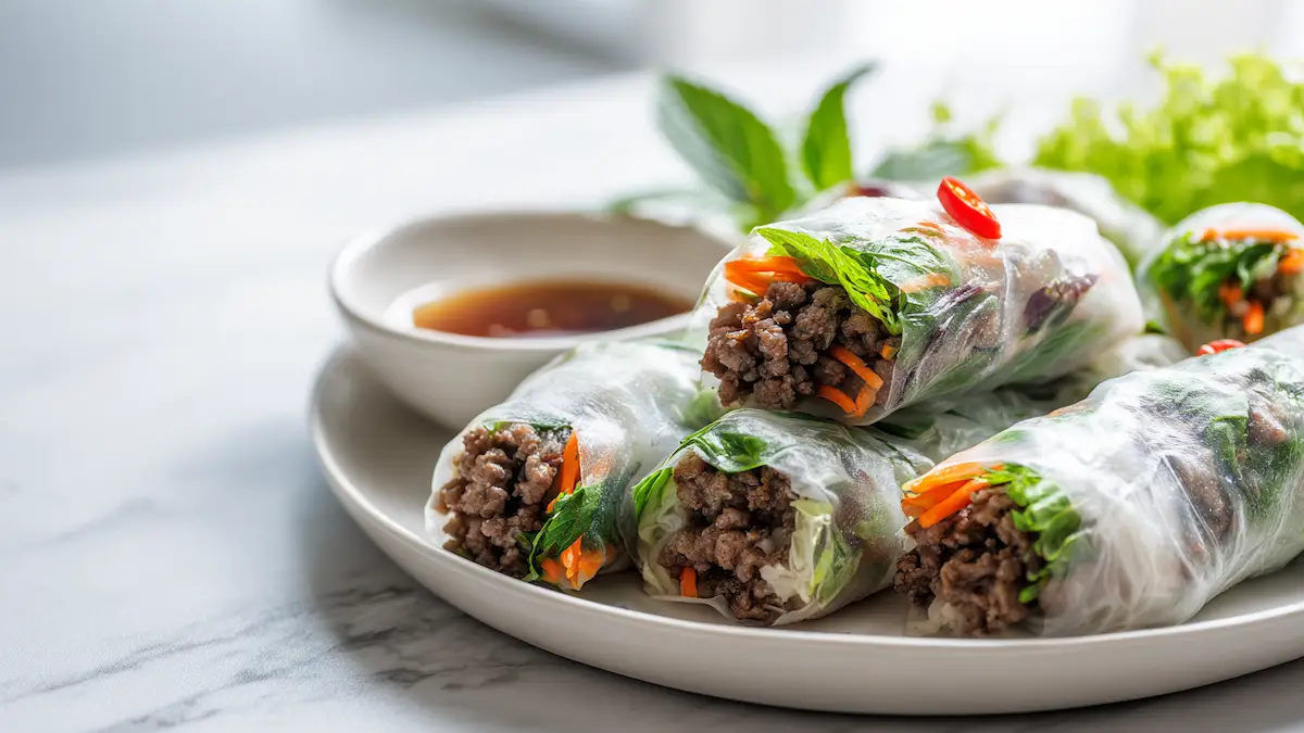 Ingredient-wise, Thai basil is the star that sets these rolls apart from regular beef wraps. It has a naturally spicy, slightly licorice-like aroma that pairs beautifully with garlic, soy, and fish sauce. Ground beef brings protein and richness, while herbs and veggies keep everything light. If you want to make things even leaner, you can use extra-lean beef or swap in ground turkey, tofu, or finely chopped mushrooms for a vegetarian version. The rice paper wrappers are naturally gluten-free (just check your brand), which makes this a flexible option for mixed-diet gatherings.
