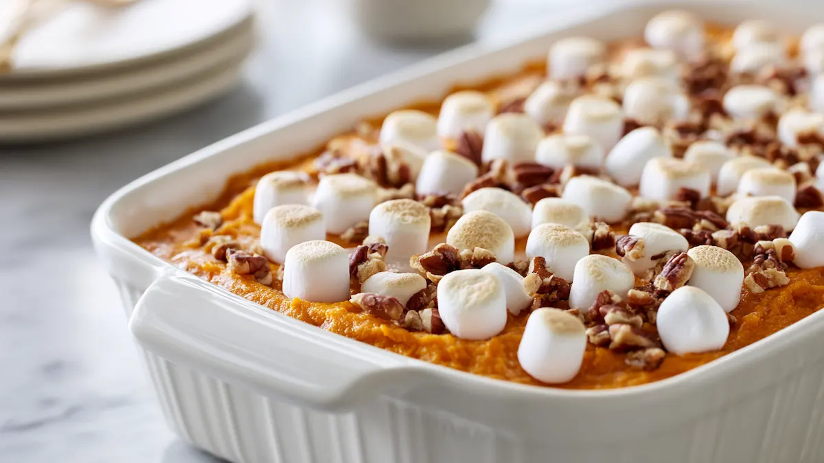 • Less Sweet “Dinner Style”: Cut brown sugar in the filling to 1 tbsp, skip marshmallows, and top with only the pecan crumble for a more savory-leaning side.